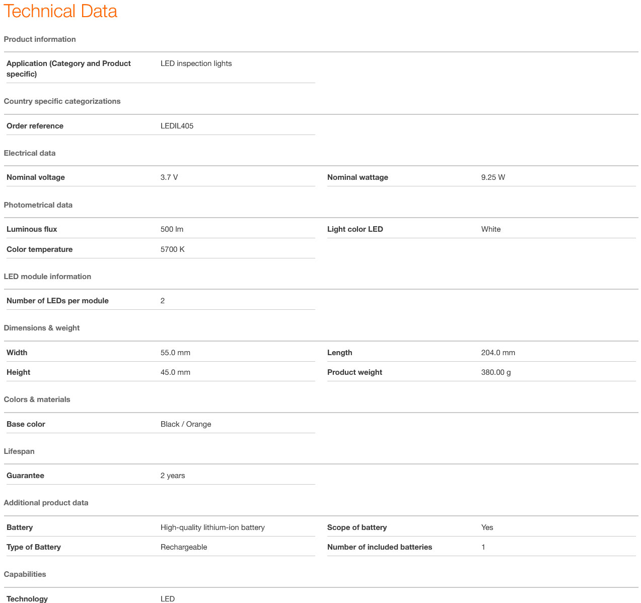 Lanterna de inspecție este reincărcabilă, iar indicatorul de nivel de incărcare integrat arată starea curentă a bateriei. Un cablu de incărcare USB de tip C și adaptorul de alimentare corespunzător sunt incluse in pachetul de livrare. in conformitate cu gradul de protecție IP65, această lampă de inspecție are protecție impotriva pătrunderii prafului și apei și este testată pentru rezistența la impact in conformitate cu IK08.