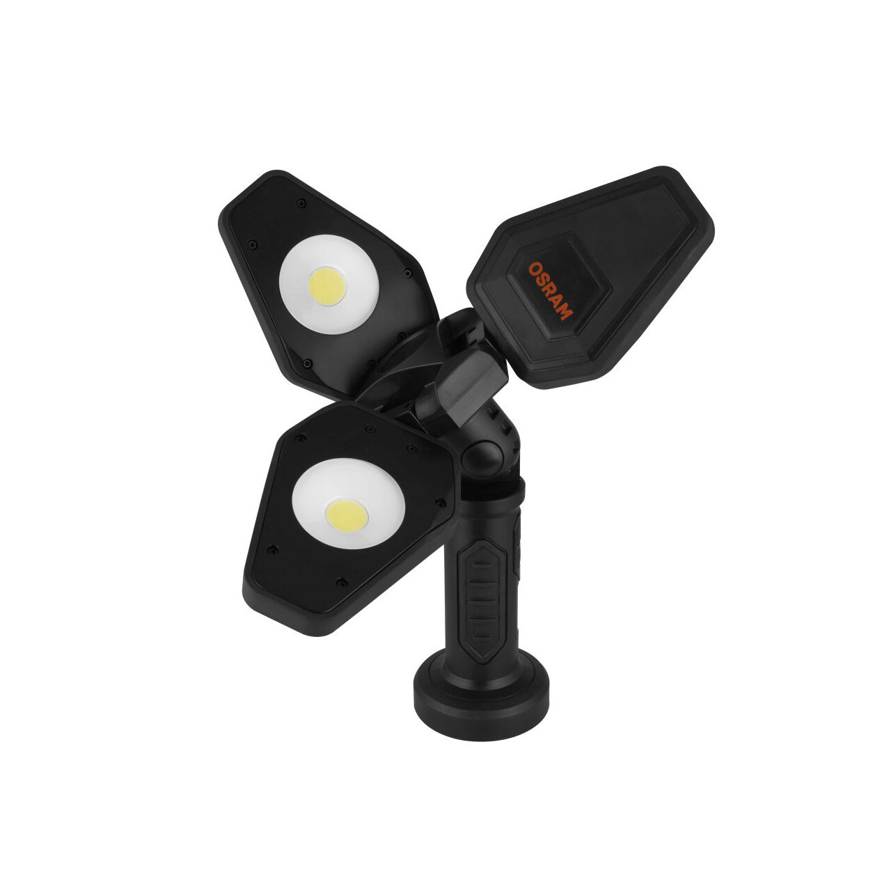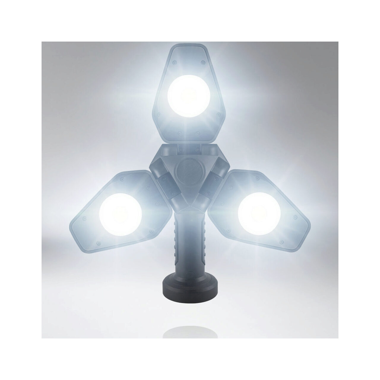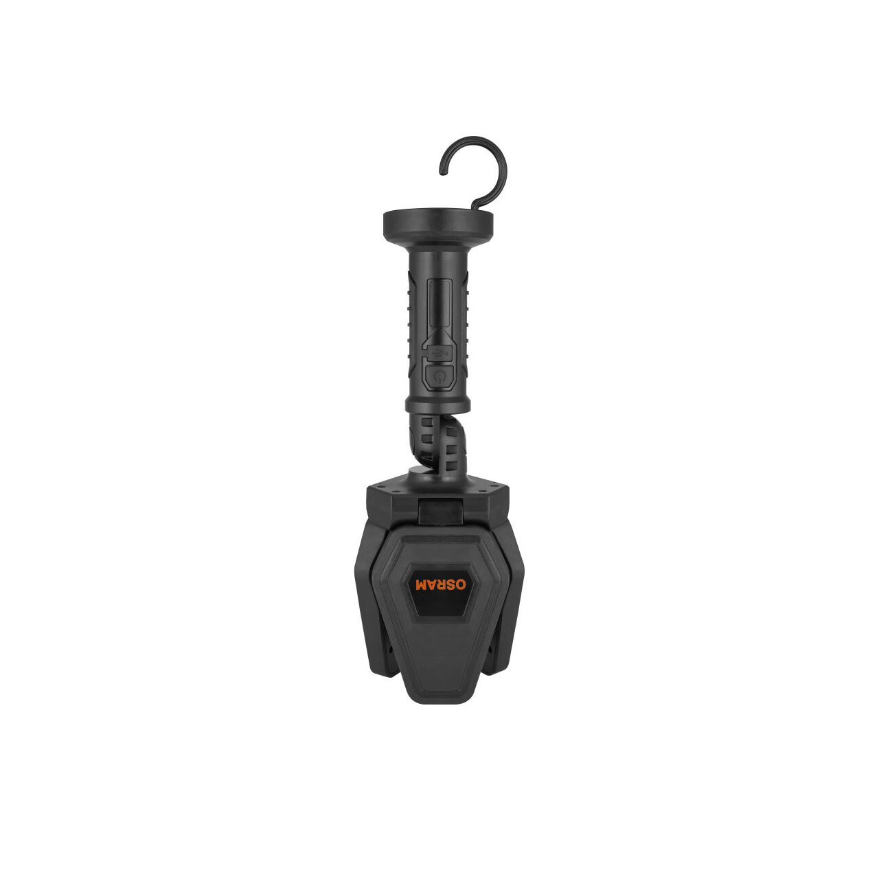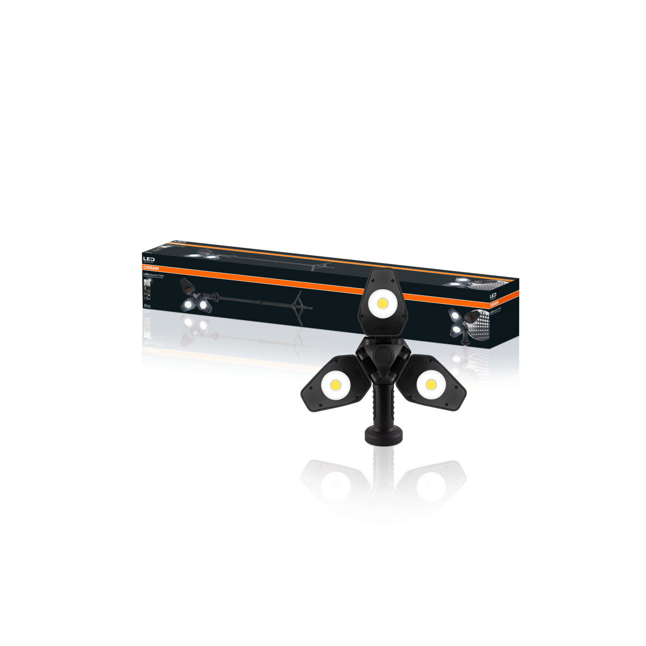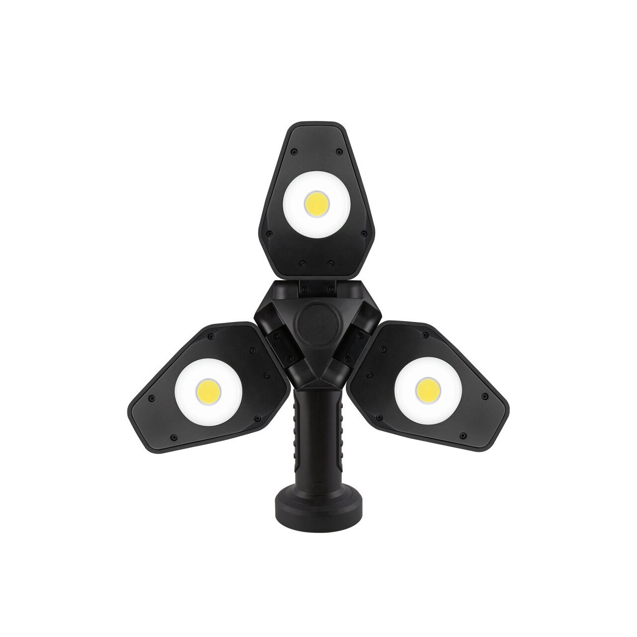 Această lampă de lucru LED multifuncțională intr-un design extraordinar cu un trepied care poate fi extins pană la 1,75 m și un cap multidirecțional, adică elementele individuale pot fi deplasate independent unele de altele, are și o suprafață antiderapante și care respinge murdăria, include un carlig rotativ integrat pentru montare pentru lucrul cu mainile libere și, prin urmare, este ideal ca lampă de lucru pentru o mai bună iluminare a compartimentelor motorului, caroseriei vehiculelor, garajelor și atelierelor