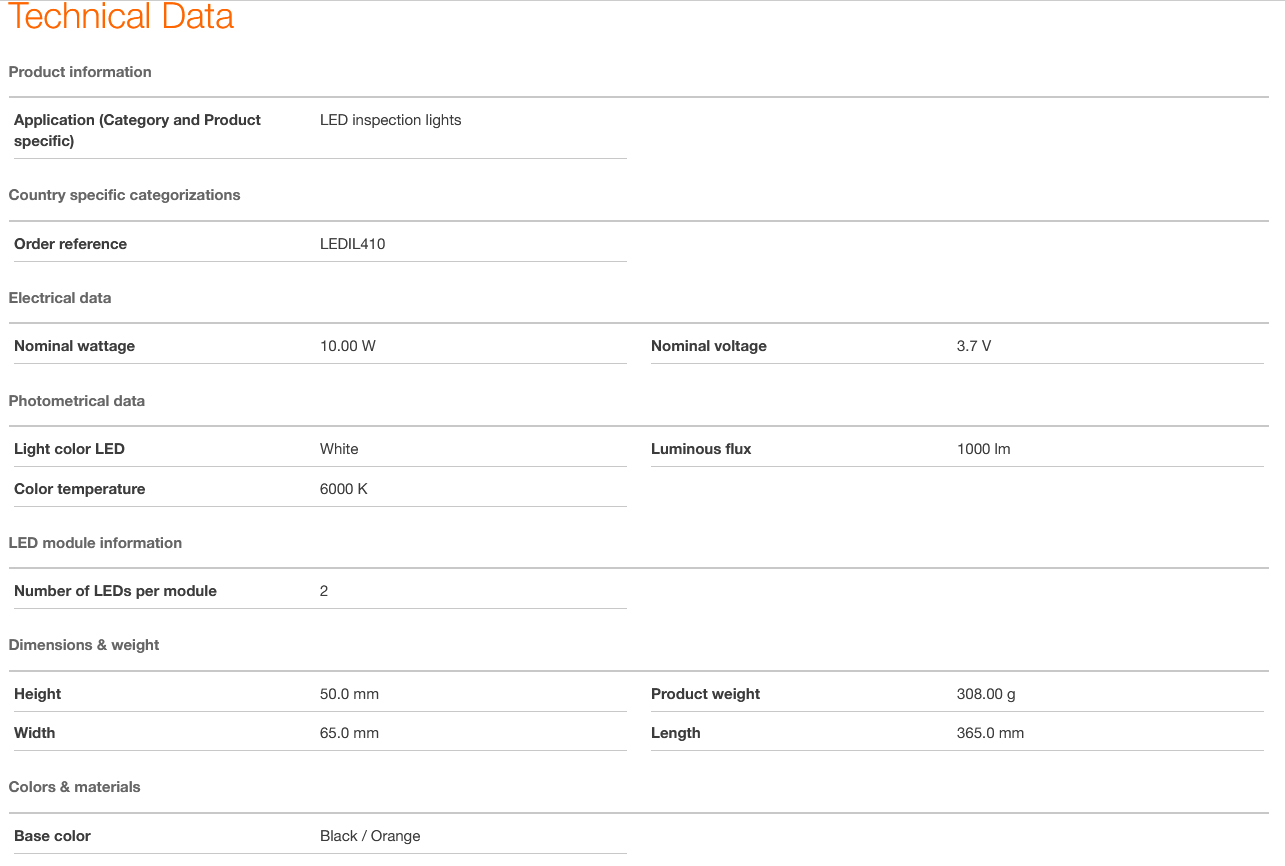 Lampa are un timp de funcționare de pană la 1,5 ore cu putere de lumină ridicată sau de pană la 10,5 ore cu putere de lumină scăzută. Cablul de incărcare și adaptorul de rețea sunt incluse in pachetul de livrare. in conformitate cu clasa de protecție IP IP65, această lampă de inspecție are protecție impotriva pătrunderii prafului și apei și este testată pentru rezistența la impact in conformitate cu IK06.