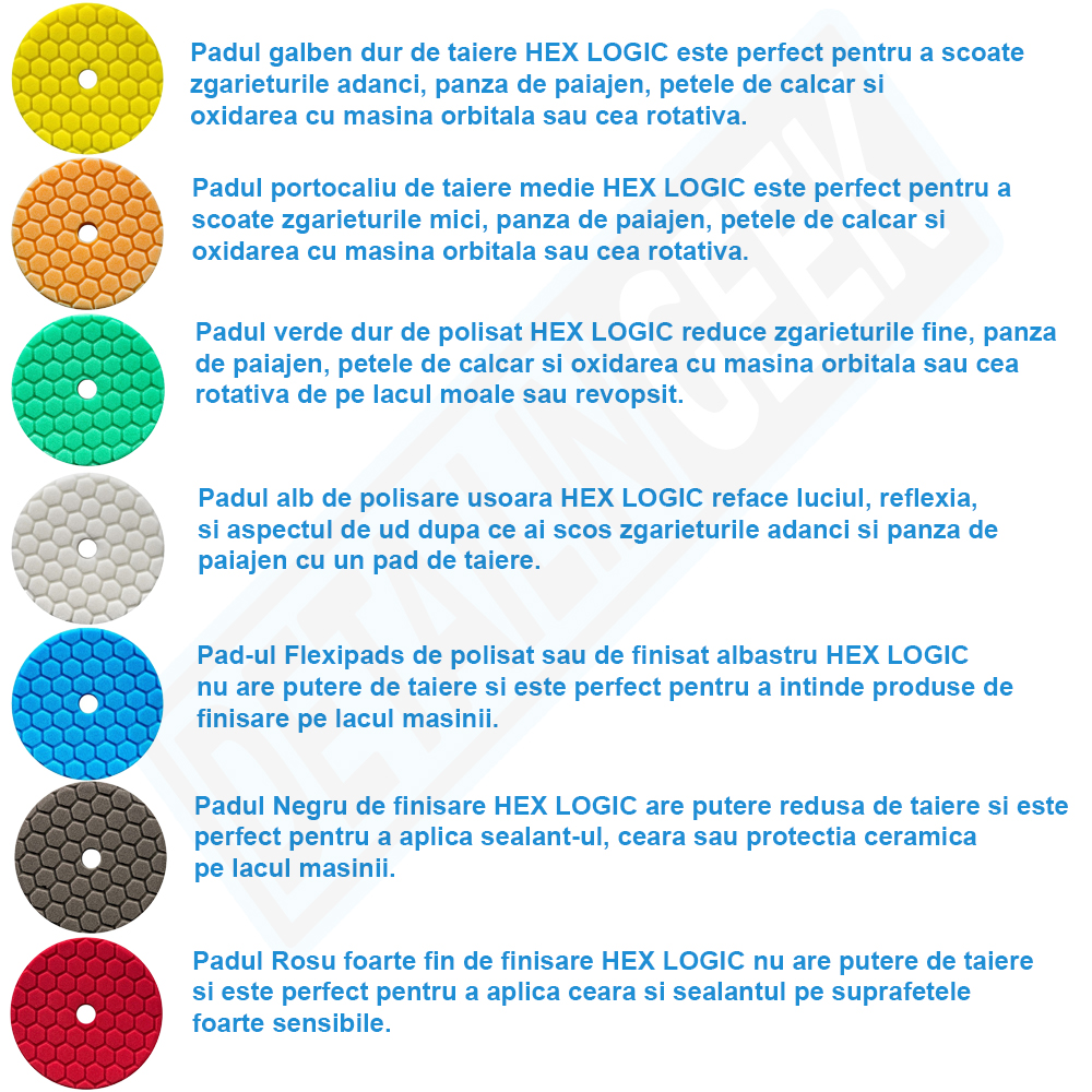 Noile paduri FLEXIPADS PRO-DETAIL ofera o interfata si o prindere mai buna pe taler pentru a disipa caldura de la masina si utilizator. Tehnica imbunatatita de producere, adezivul si materialul asigura ca padurile Hex-Logic ofera o experienta unica cu rezultate mai bune si durabilitate ridicata. Inginerii au prelungit viata padurilor Hex-Logic si eficienta lor adaugand o gaura de precizie pentru ventilatie. Ventiland pad-ul cand acesta se roteste la viteze mari reduce stres-ul provocat de cuplul masinii de polisat si ghideaza caldura in afara zonei unde se incalzeste cel mai tare. Padurile Hex-Logic acopera intreaga gama, de la cele pentru taiere si polisare pana la cele de finisare si aplicare ceara.