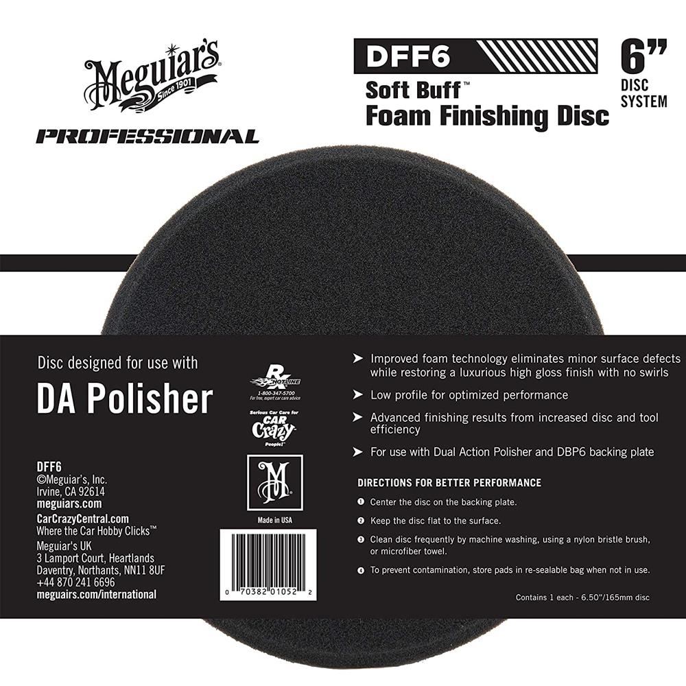 Poate fi utilizat cu masina de polisat orbitala Meguiar's Dual Action Polisher MT300 și talerul DBP6 Soft Buff DA de 6 inchi. Velcro-ul permite discului de finisare să se lipească ferm de taler in orice moment. Se spala la masina si se poate reutiliza.