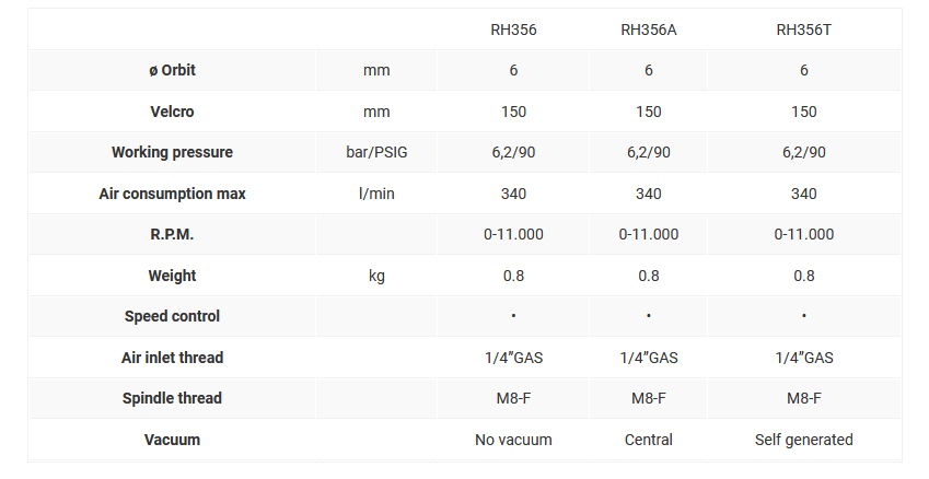 Skoprio III de 6 mm poate fi folosit pentru orice operație de șlefuire cu dublă acțiune, de la pregătirea umpluturii pentru caroserie pană la șlefuirea finală a vopselelor cu strat transparent. Orbita de 6 mm este un echilibru excelent intre confort, control și eficiență. Disponibil in standard, fără vid (RH356), vid (RH356A) sau vid autogenerat (RH356T).