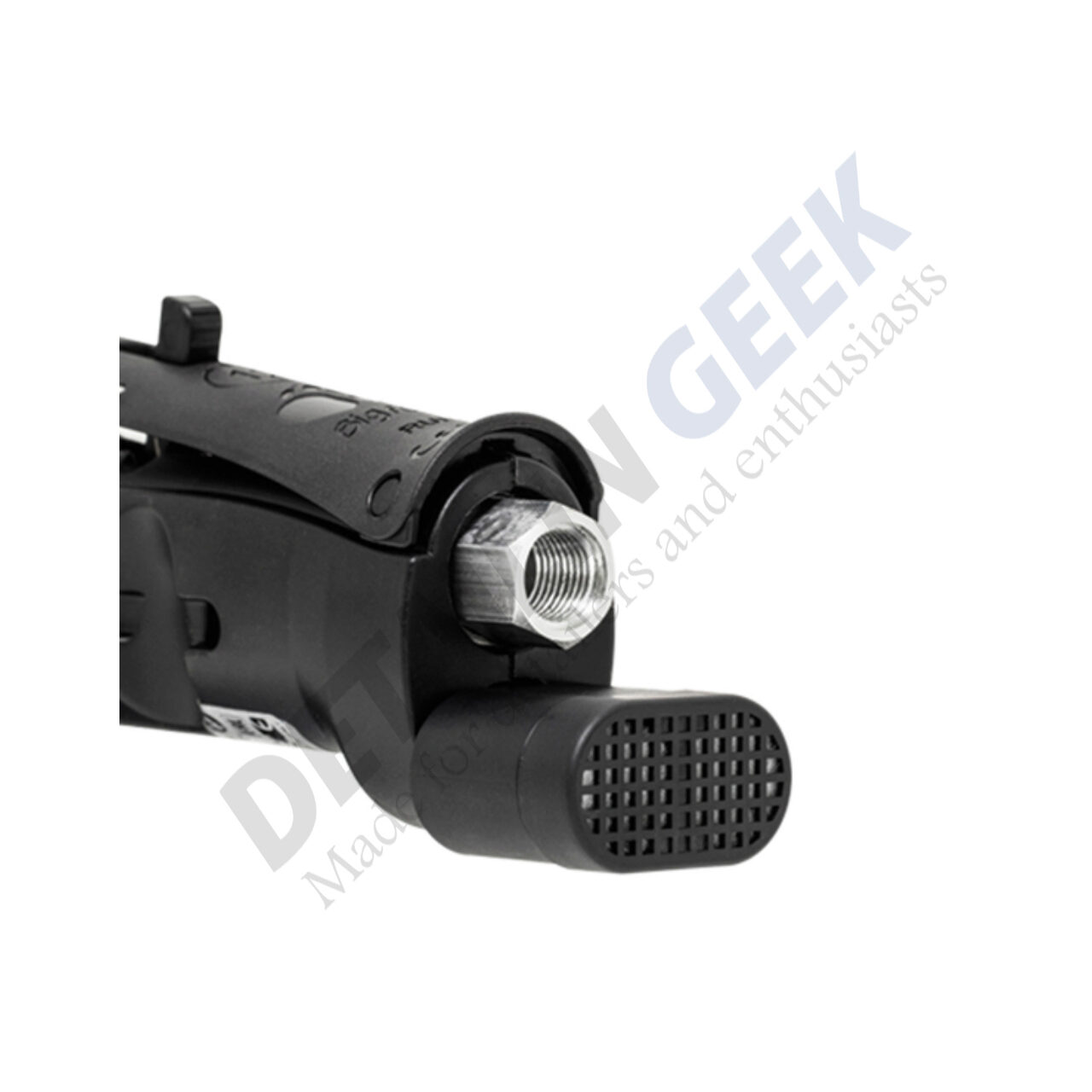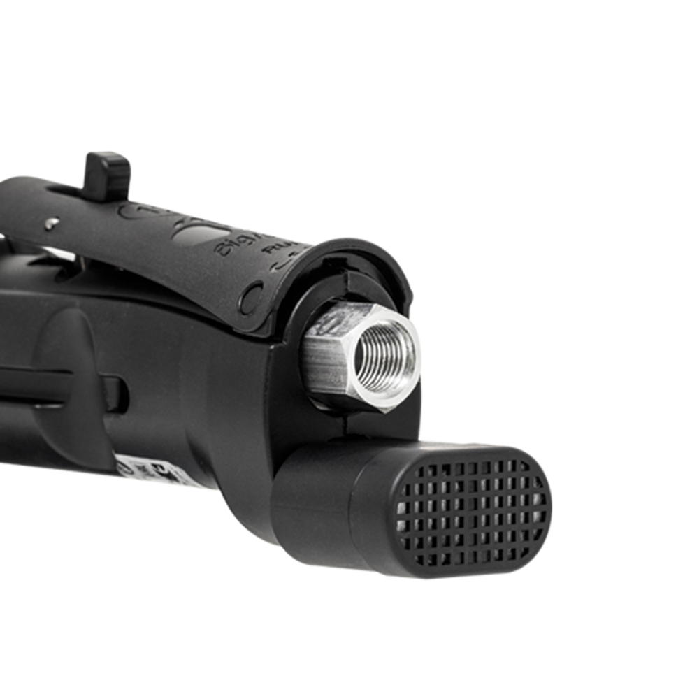 Pe langă faptul că este o priză de aer, dispozitivul acționează și ca un amortizor de zgomot. Montat langa racordul de aer de pe segmentul inferior al sculei, acest amortizor dublu este extrem de eficient la atenuarea zgomotului generat de fluxul de aer comprimat. Acest lucru este benefic in special in mediile de magazine unde multe unelte pneumatice pot funcționa simultan sau operatorii pot folosi uneltele pentru perioade lungi de timp.