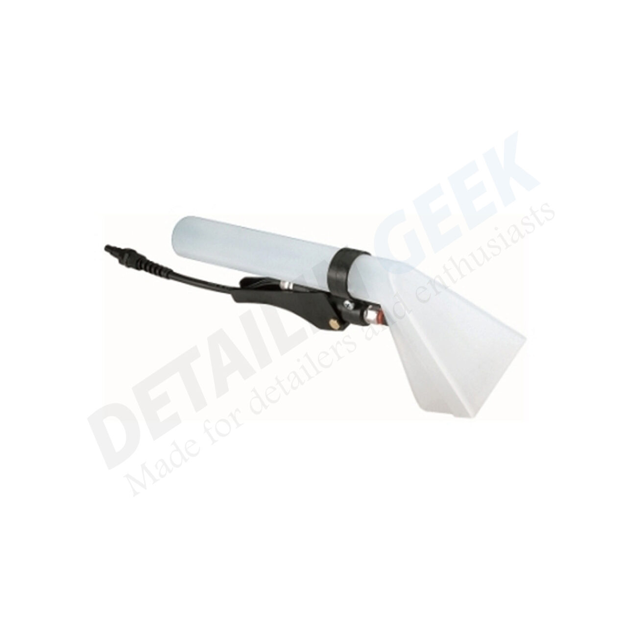 Instrument de mană din plastic transparent pentru curățarea prin injecție-extracție a covoarelor și tapițeriei, cu parghie de pulverizare metalică.