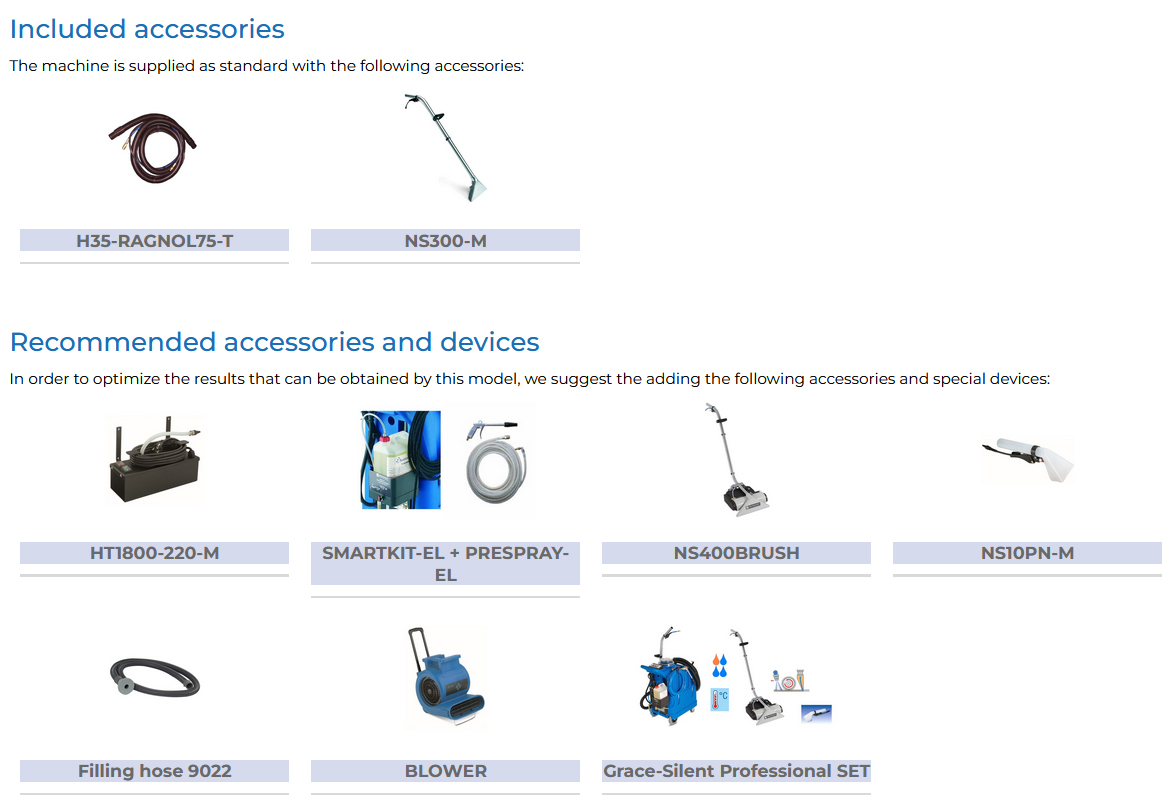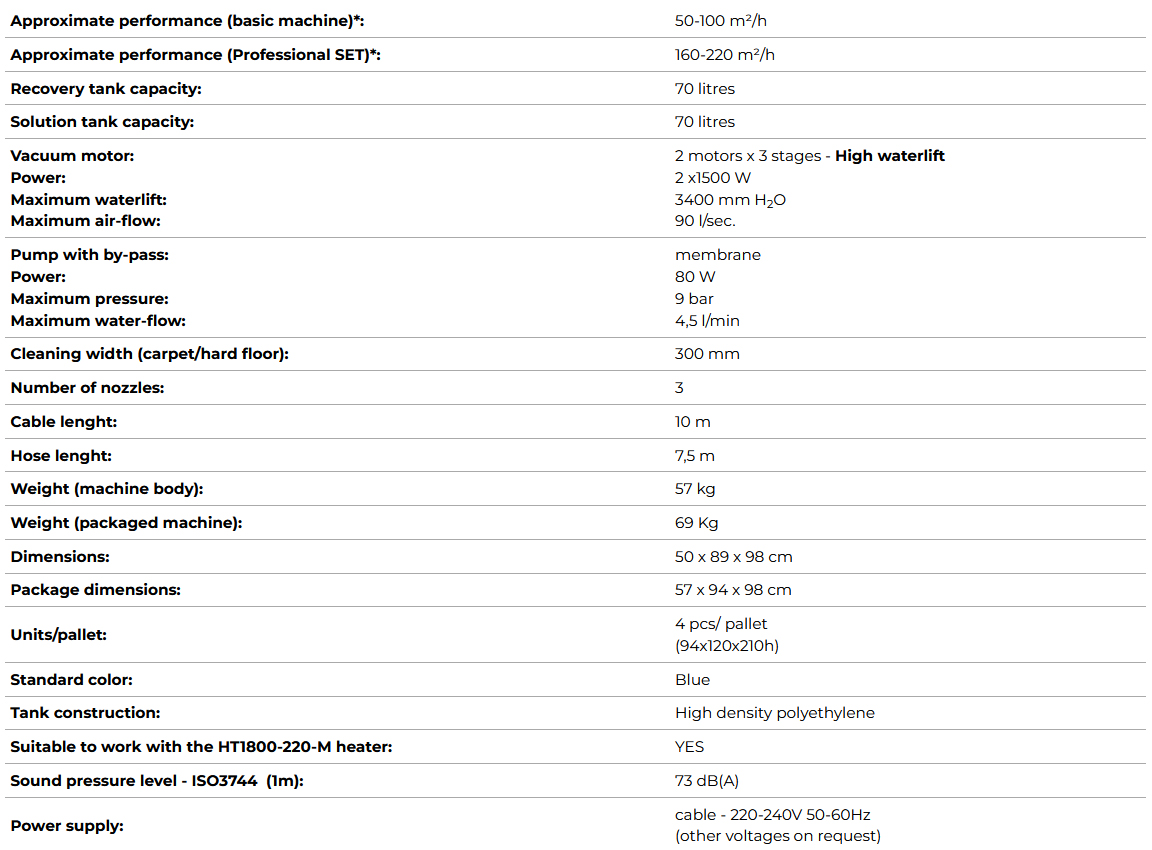 Poate fi furnizat cu unitatea de apă caldă instant HT1800 și cu una dintre baghetele opționale pentru perie electrică. Adăugand sistemul patentat SMARTKIT, este posibilă efectuarea automată de dozare chimică, pre-pulverizare și clătire a covorului. Folosind substanța chimică MICRO-KILL puteți igieniza rapid covorul.
