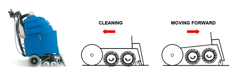 După curățarea unei dungi de covor, mișcandu-se inapoi, este suficient să impingeți ușor manerul in jos și roți speciale de sprijin vor ridica mașina, care poate aluneca cu ușurință inainte pană la inceputul următoarei dungi, fără niciun efort pentru operator. Nu este necesar să indoiți mașina inapoi spre operator și să o impingeți inainte, menținand-o in echilibru pe roțile din spate, așa cum se intamplă cu toate extractoarele cu tragere inapoi de pe piață.