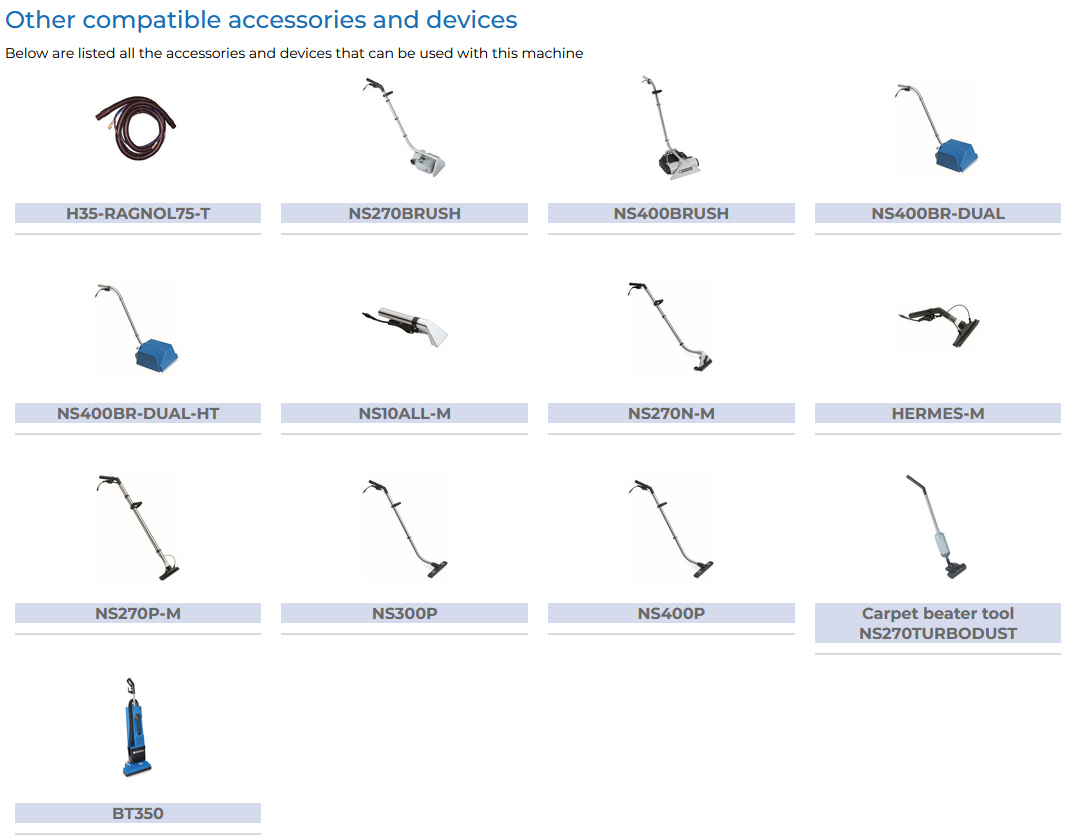 Posibilitatea de a conecta mașina cu unelte opționale pentru curățarea colțurilor greu accesibile. De exemplu, odată ce curățarea unui coridor dintr-un hotel este finalizată, unealta pentru covoare NS300 poate fi conectată la mașină pentru a curăța in interiorul camerelor.