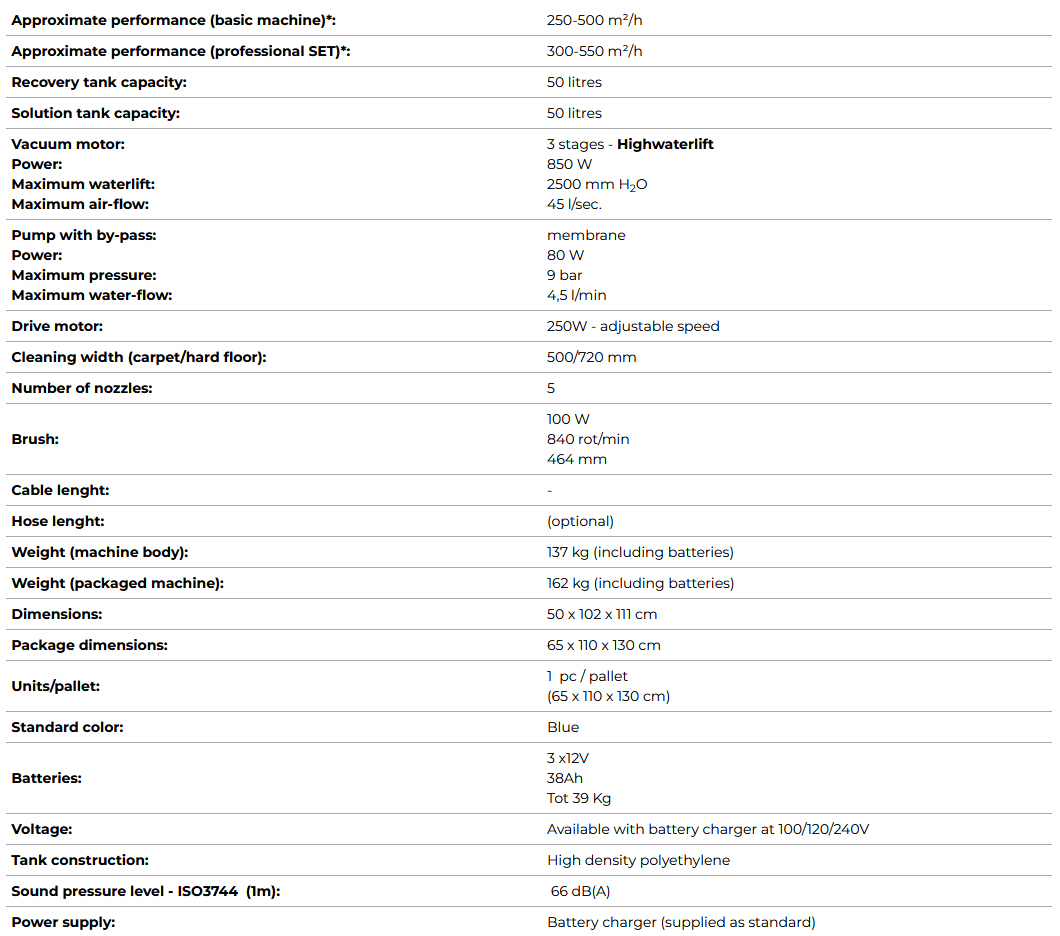 Fără cablu de alimentare, este ușor de utilizat cu Elite-Battery in zone mari, de exemplu in hoteluri, centre comerciale, aeroporturi, săli de convenții. Elite-Battery este un extractor foarte silentios, deoarece funcționează doar cu 60 de decibeli. Este posibilă reglarea presiunii periei și a capului de aspirare, in funcție de tipul de covor. Debitul de apă poate fi reglat, pentru o curățare de intreținere cu umiditate scăzută sau pentru o curățare profundă de restaurare.