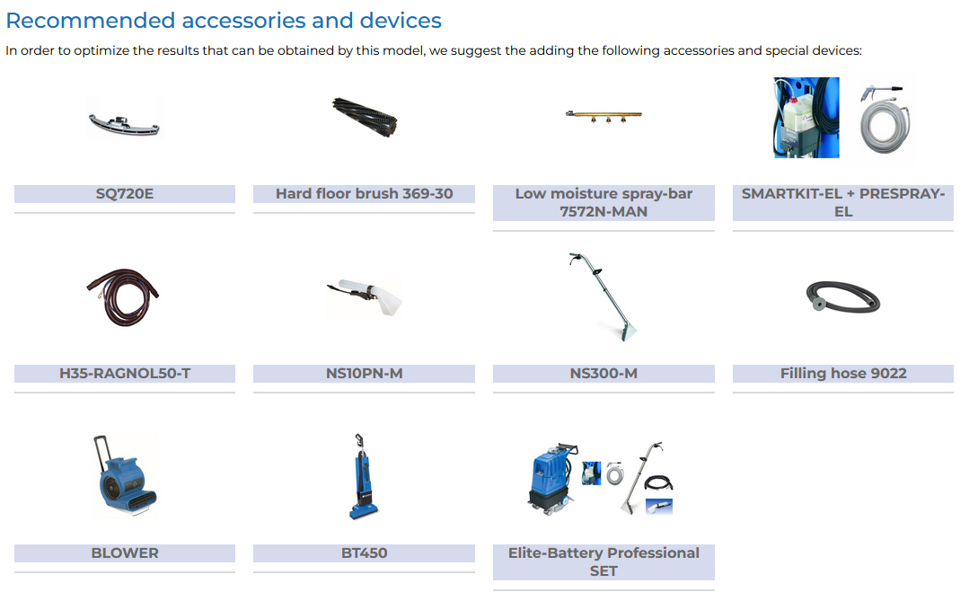 Dacă este echipat cu sistemul opțional brevetat SMARTKIT, este posibilă efectuarea automată de dozare chimică, pre-pulverizare și clătire a covorului. Racleta opțională SQ720E permite curățarea podelei dure. Este disponibilă și o perie suplimentară, specifică pentru curățarea podelelor dure.