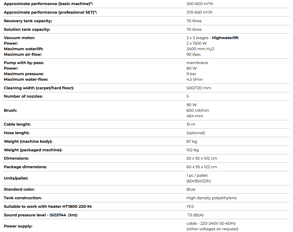 Powerful-Silent este o mașină autopropulsată concepută pentru a curăța suprafețe foarte mari de covor. Spală, perie și usucă o dungă de 50 cm de covor, inaintand cu viteză reglabilă, curățand pană la 600 de metri pătrați intr-o oră. Sistemul său de aspirare cu ridicare mare de apă permite recuperarea cantității maxime de murdărie de pe covor și obținerea unui timp de uscare cel mai scurt. Diferenţialul motorului de antrenare permite maşinii să se rotească fără efort, oferindu-i o bună manevrabilitate chiar şi in zone inguste, ca de exemplu pe coridoare. Presiunea periei rotative poate fi reglata, in functie de tipul de covor. Debitul de apă poate fi reglat, pentru o curățare de intreținere cu umiditate scăzută sau pentru o curățare profundă de restaurare. Puternic-Silent poate fi furnizat cu unitatea de apă caldă instantanee HT1800. Dacă este echipat cu sistemul patentat SMARTKIT, este posibilă efectuarea automată de dozare chimică, pre-pulverizare și clătire a covorului. Racleta opțională SQ720E permite curățarea podelei dure. Este disponibilă și o perie suplimentară, specifică pentru curățarea podelelor dure.