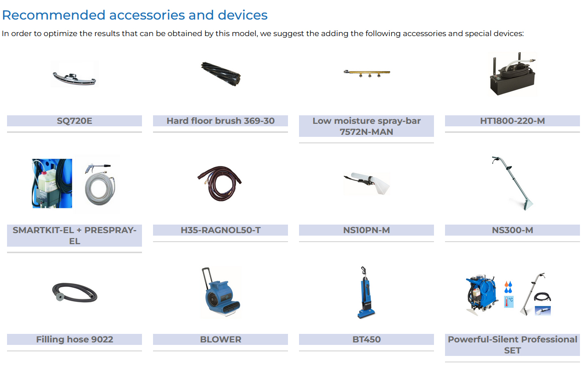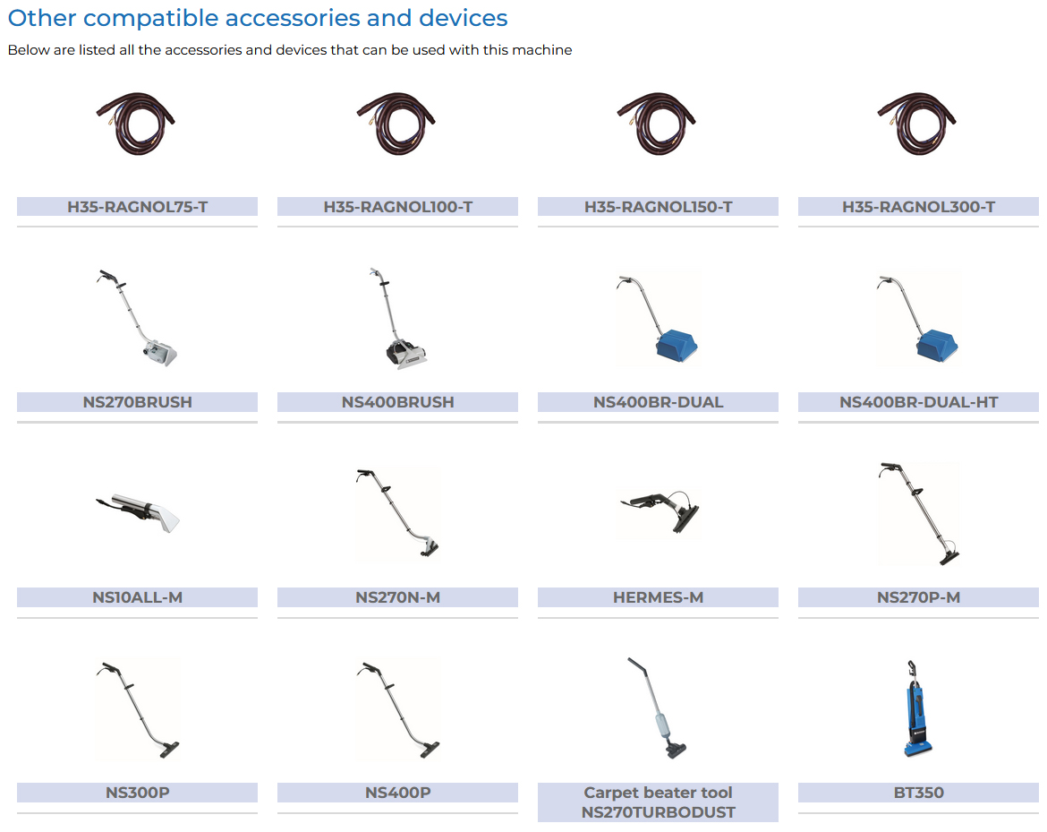 Posibilitatea de a conecta mașina cu unelte opționale pentru curățarea colțurilor greu accesibile. De exemplu, odată ce curățarea unui coridor dintr-un hotel este finalizată, unealta pentru covoare NS300 poate fi conectată la mașină pentru a curăța in interiorul camerelor.
