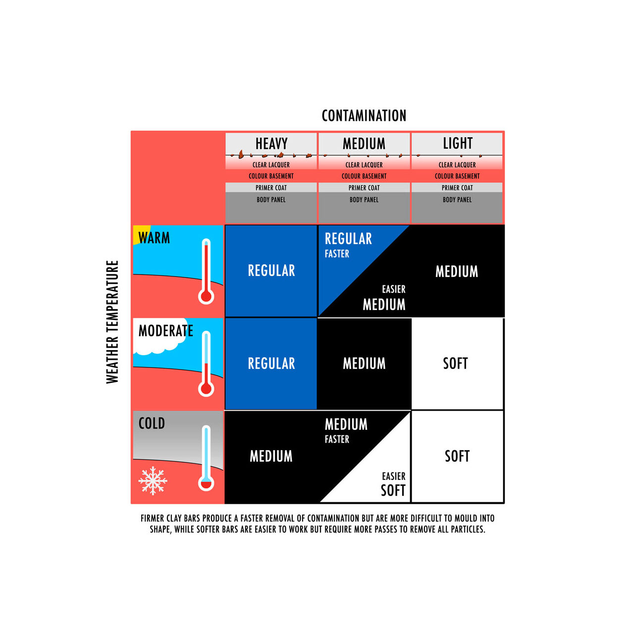 Dacă autovehicolul este foarte contaminat, nu a fost decontaminat pană acum, sau este foarte cald afara, folosește Regular (dură). Toate batoanele de argilă devin tari cand este frig si moi cand este foarte cald.