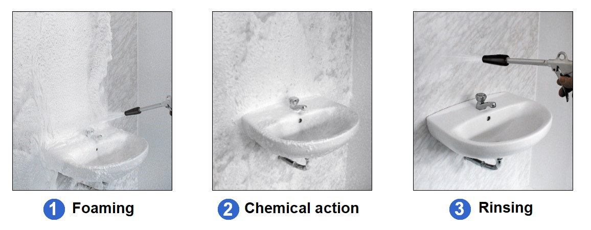 Efectul vizual al spumei: spuma acoperă in alb toate suprafețele pe care este pulverizată precum pereți, chiuvete, corpuri de iluminat. Operatorul poate astfel verifica dacă fiecare colț a fost acoperit, permițand astfel o acțiune completă in fiecare punct.