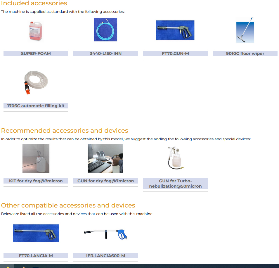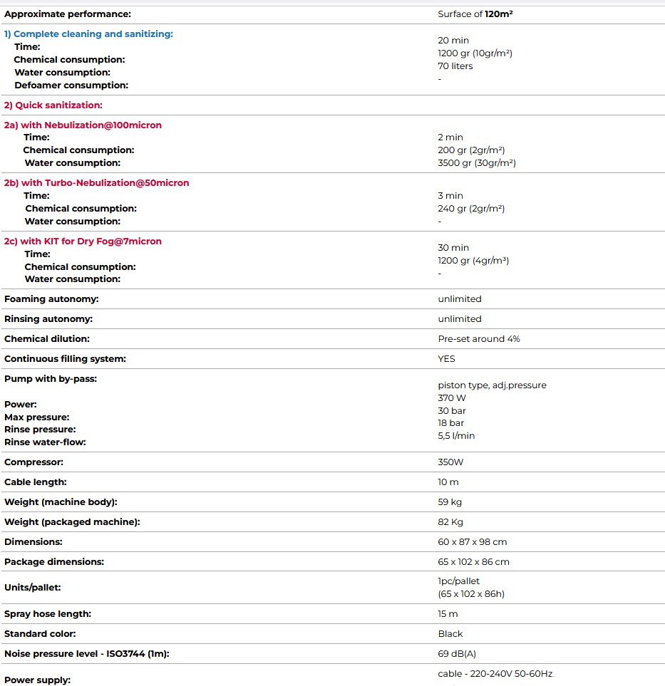 Mai mult, prin adăugarea unui dispozitiv special Santoemma, este posibilă livrarea unui produs chimic de igienizare sub formă de ceață uscată de 7 microni. Ceața uscată se livrează pentru un timp suficient pentru a umple complet incăperile și apoi se lasă să acționeze cateva minute pentru a-și exercita acțiunea de igienizare. Acest tip de ceață uscată vă permite să ajungeți in fiecare punct, fără a umezi suprafețele. Aparatul poate fi lăsat in interiorul incăperii pentru a fi tratat. Alternativ, puteți lăsa mașina in afara incăperii, plasand in interior doar rezervorul de produse chimice.