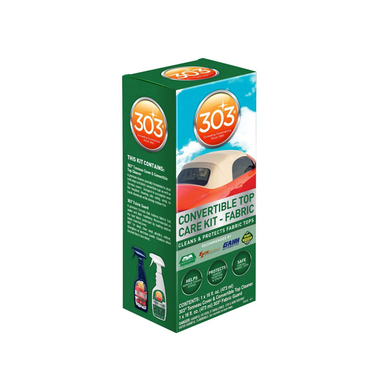 Cu acest kit, ingrijirea adecvată a soft top-ului tău decapotabil este ușoara! Vă va economisi bani și va adăuga ani la viața soft top-ului tău decapotabil. Acest kit conține atat 303® Tonneauetergent pentru topuri convertibile, pentru a ajuta la indepărtarea petelor, murdăriei și resturilor, și 303® Fabric Guard pentru a ajuta la restabilirea hodrofobiei și respingerea apei și a petelor pe țesături, pentru a vă menține topul decapotabil cu un aspect mai nou, o perioadă lungă de timp.