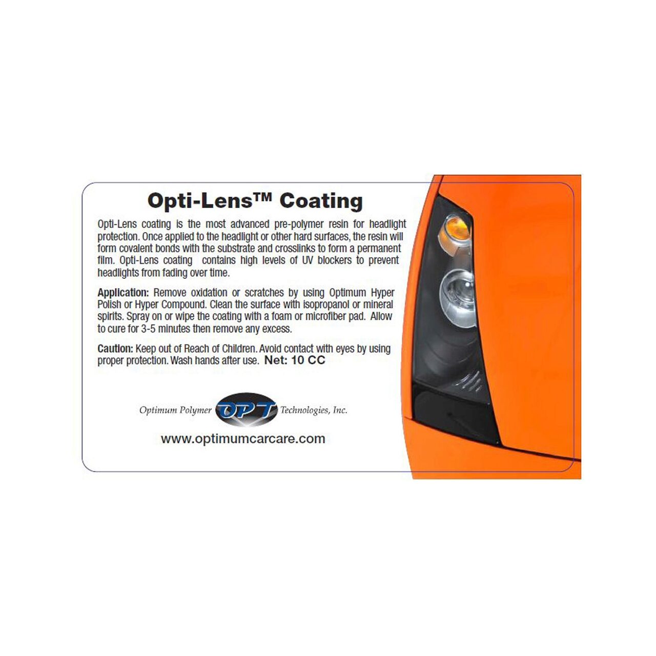 Optimum Opti-Lens Coating este cel mai avansat sistem de polimeri special formulat pentru protecția farurilor. Acest hibrid pe bază de rășini este o combinație de rășină din protecția ceramică Opti-Gloss Coat și rășini acrilice pentru a se fixa cat mai bine pe suprafața de policarbonat. De asemenea Optimum Opti-Lens Coating conține un strat protector ce absoarbe ultravioletele pentru a reduce decolorare și oxidarea ce apare pe faruri.