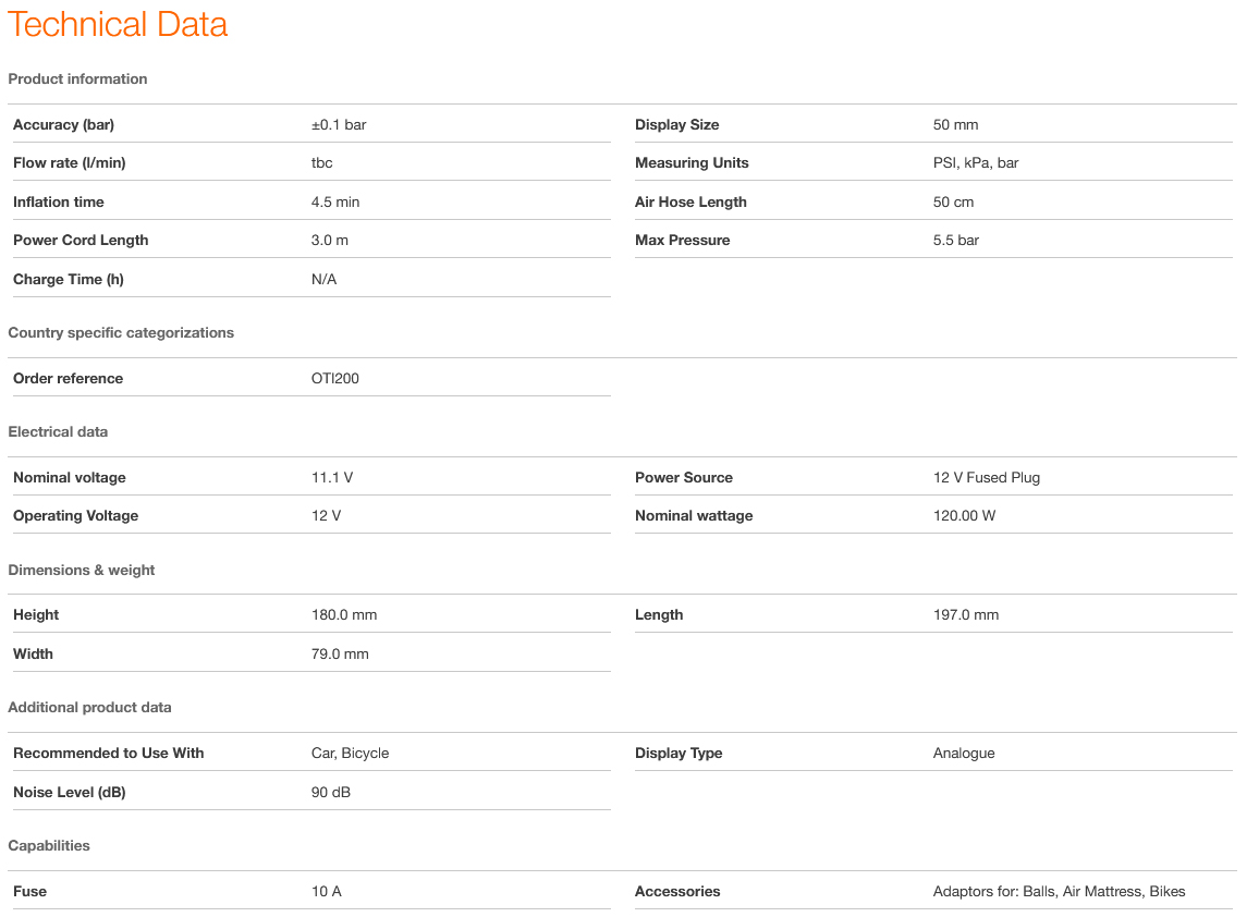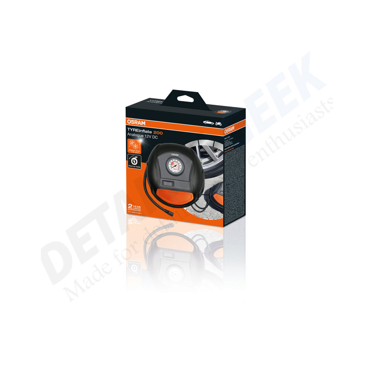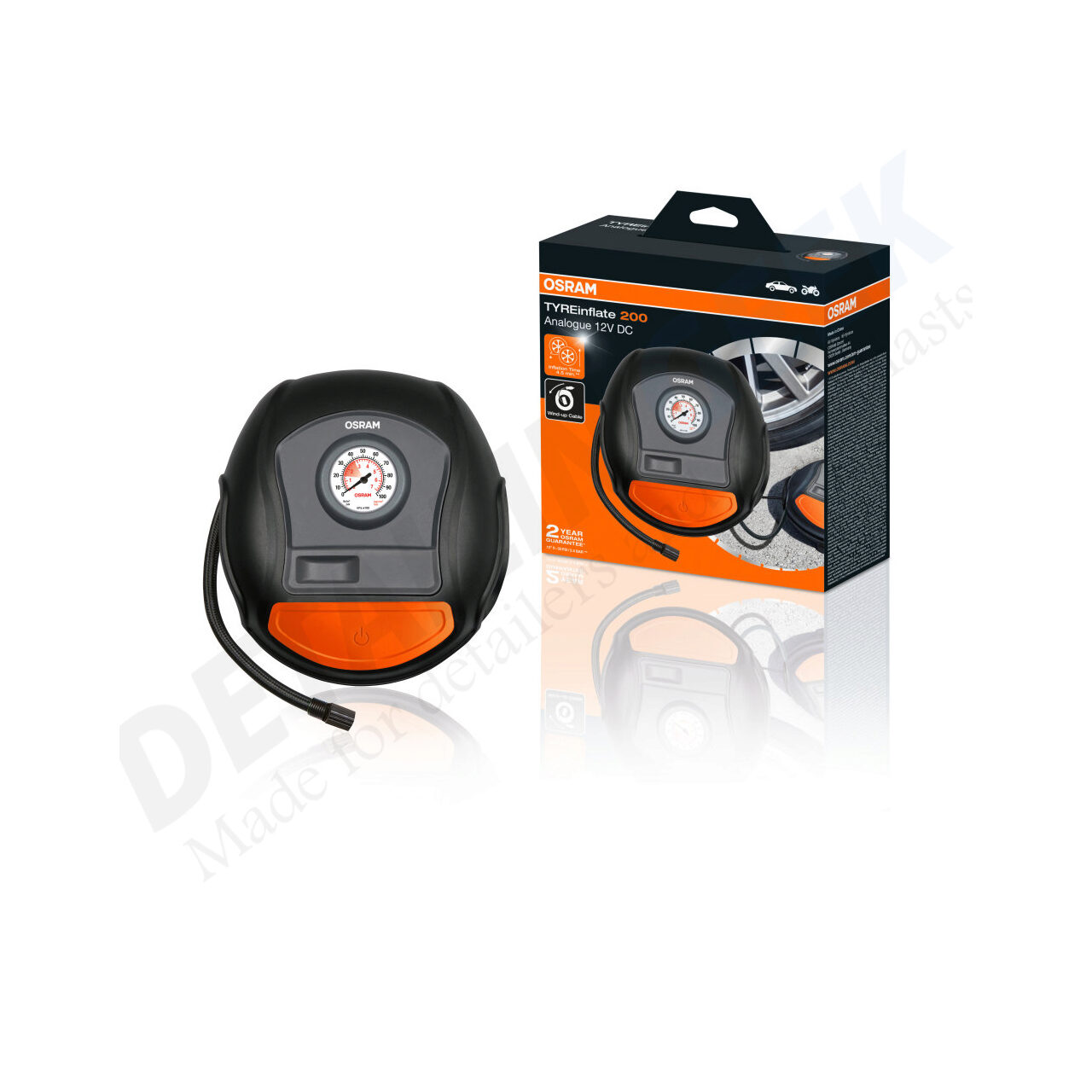 Alimentat de la o priză de 12 V a mașinii, cablul de alimentare lung de 3 m al Tyreinflate 200 facilitează accesul la toate anvelopele din jurul vehiculelor. Afișează valorile presiunii in kPA, bar și PSI. Include un compartiment de depozitare pentru capacele supapelor anvelopelor atunci cand sunt utilizate.