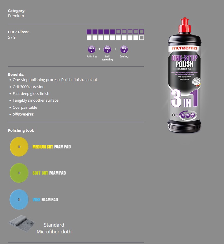 Menzerna 3-in-1 este un produs abraziv mediu care reuseste sa scoata zgarieturi de 3000 cu masina de polisat, dar lasa in urma un strat protector de ceara si un luciu intens.Acest produs iti economiseste timp atunci cand doresti sa faci totul intr-un singur pas, iar masina nu necesita corectie foarte mare.