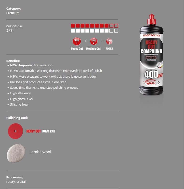 Odată cu refacerea compusului Heavy Cut Compound 400 original, am putut să ne imbunătățim și mai mult polisarea in mai multe etape. Formula imbunătățită asigură o muncă eficientă și ușor de utilizat.
