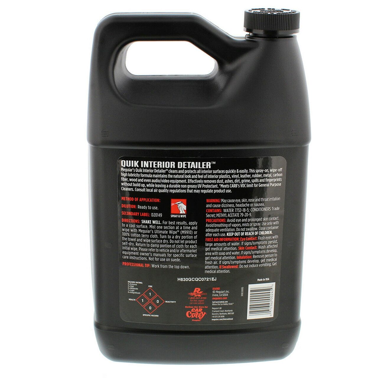 Meguiars Quik Interior versiunea Profesionala curata si protejeaza toate suprafele interioare rapid si usor. Doar pulverizeaza si sterge cu o laveta Heavy Duty, suprafata ramane curata si protejata! Produsul e foarte bun pentru toate materialele: plastice, vinilin, piele, chedere, metal, lemn chiar si pentru echipamentul audio si video. Meguiars Quik Interior Detailer lasa o protectie foarte buna impotriva razelor ultraviolete UV, iar interiorul tau arata ca nou pentru o perioada foarte lunga!