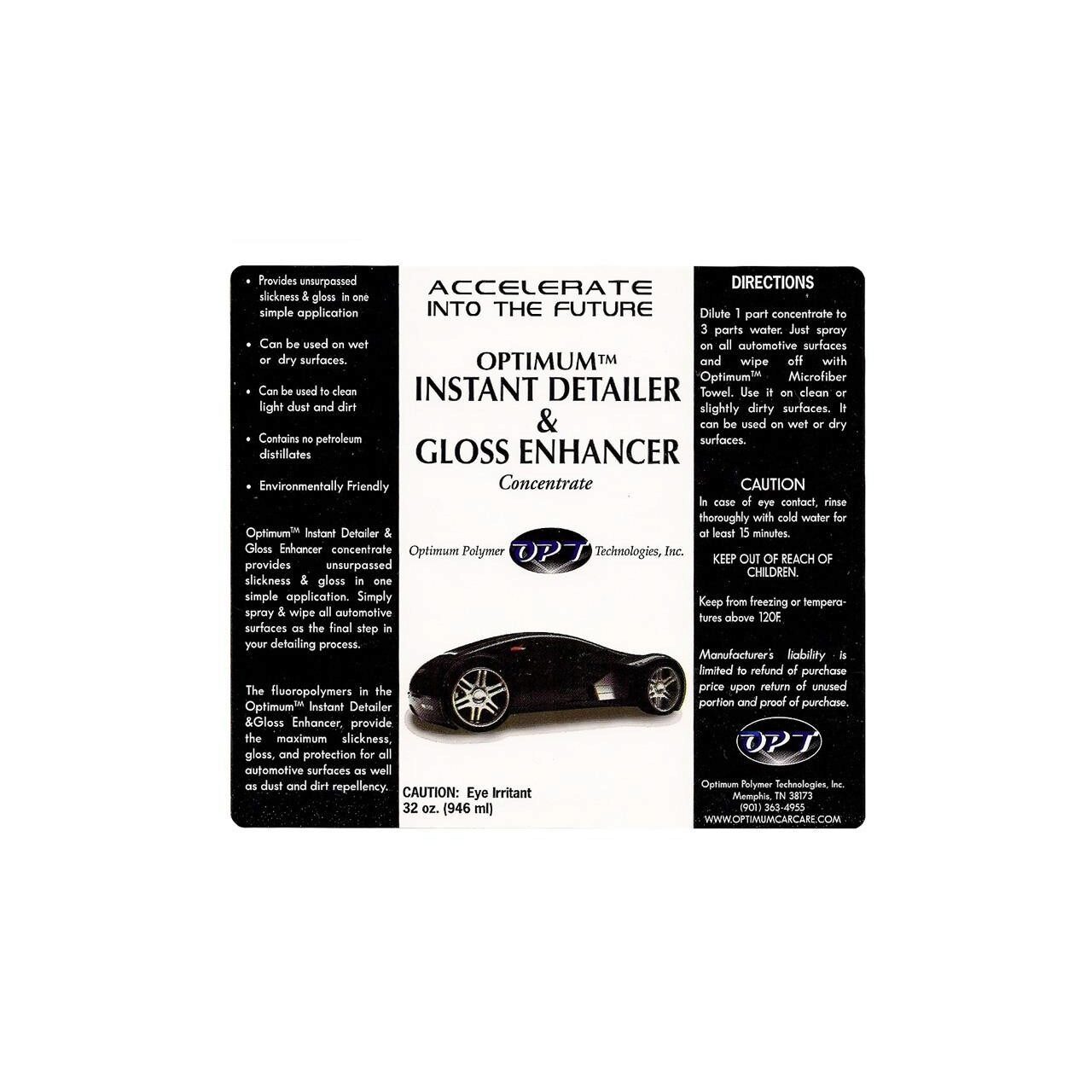 Optimum Instant Detailer & Gloss Enhancer utilizează polimeri pe bază de faină, care sunt puternici si durabili şi sunt foarte alunecos. Nimic nu aderă la ei. Teflonul este facut din polimeri din faină. Polimerii pe bază de făină dau quick detailerului, impermeabilitatea de a respinge praful, mizeriei, uleiurilor, si a apei. Folosirea după spălare menţine maşina ta mai curată.