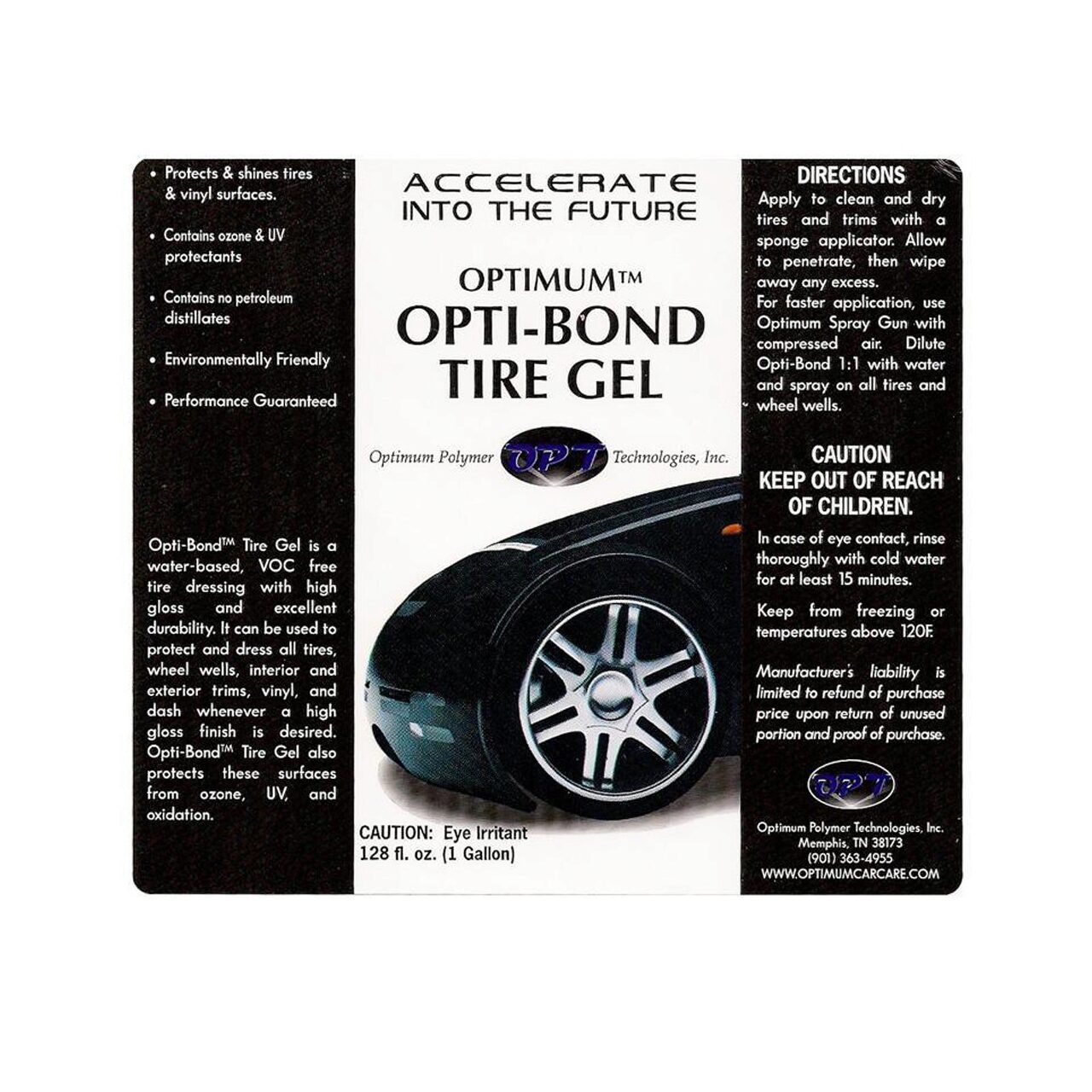 Pe langă aspectul plăcut,Opti-Bond Tire Gel ,produce o protecție durabilă, fiind o formulă care are inhibitori pentru ozon și ultraviolete, ceea ce protejează anvelopele si plasticele impotriva razelor solare și a poluării atmosferice. Vinilinul si cauciucul raman elastice, flexibile și isi păstrează culoare folosind des Opti-Bond Tire Gel. Soluția Opti-Bond Tire Gel creează o suprafață luciosă și nu unsuroasă, placută la atingere. Fiind o formulă pe bază de apă nu atrage praful.