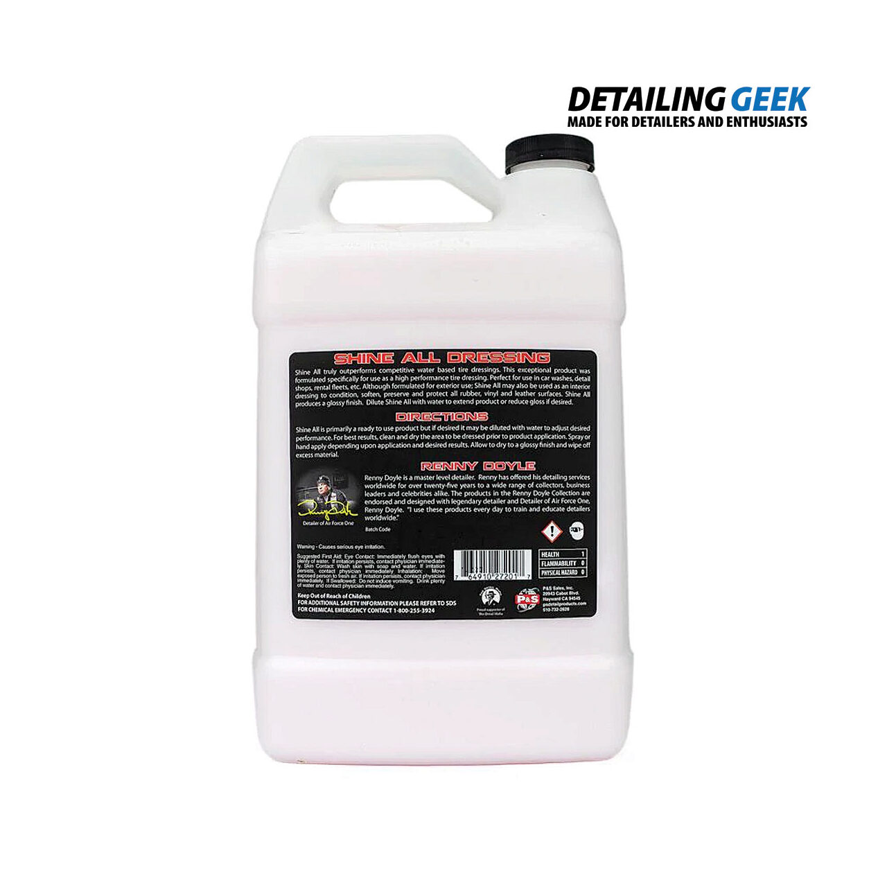 Perfect pentru utilizare în spălătorii auto, magazine de detaling, flote de închiriere, etc. Deși formulat pentru uz exterior; Shine All poate fi folosit și ca protectie de interior pentru a condiționa, înmuia, păstra și proteja toate suprafețele din piele, cauciuc, vinil și piele.