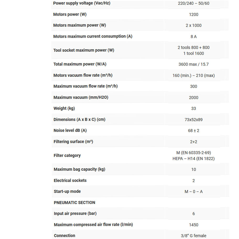 RUPES KS300 este un aspirator profesional cu STAȚIE DE LUCRU INTEGRATĂ care garantează o eficiență ridicată de filtrare cu SUPRAFAȚĂ DE FILTRARE de 5 m2 și trei etape de filtrare. Acest aspirator compact, manevrabil și puternic poate susține doi operatori simultan datorită TEHNOLOGIEI inovatoare cu DUAL MOTOR, care dispune de DOUĂ MOTOARE DE 1200 W. Motoarele pot funcționa alternativ sau împreună și un singur motor poate susține până la două unelte în același timp. Unitatea include două prize electrice și două prize pneumatice, ambele cu sistem de pornire automată, care permit conectarea sculelor .pneumatice și electrice.