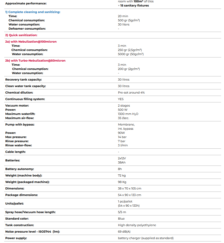 Consum redus de apă: sistemul de pulverizare + clătire la presiune scăzută necesită o cantitate minimă de apă. Acest lucru evită inundarea incăperilor, permite o autonomie de lucru mai indelungată și oferă disponibilitatea imediată a incăperilor care au fost curățate.