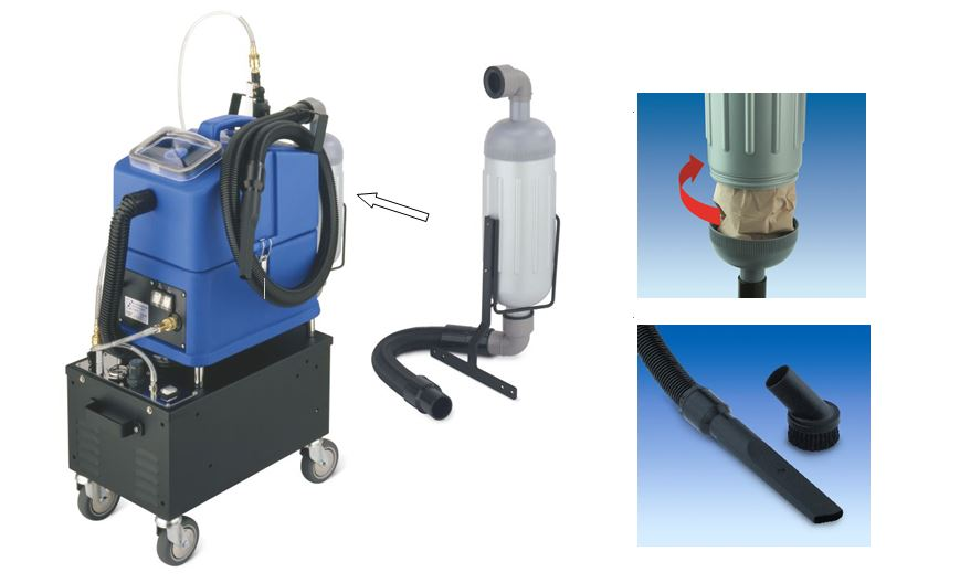 Cu o singură mașină este posibilă indepărtarea prafului, inainte de curățare cu sistem de injecție-extracție sau de extracție cu spumă. Nu este nevoie să folosiți un aspirator dedicat.