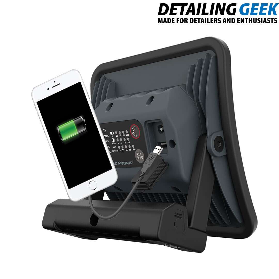 Lumină de lucru LED flexibilă. Lampa de lucru este ușor de transportat și este proiectată ergonomic pentru o prindere bună pe mâner, care este, de asemenea, echipat cu magneți puternici integrati pentru montare flexibilă. Acest lucru vă oferă o flexibilitate ridicată și posibilități de aplicare pentru inspecția internă a mașinilor și a altor zone înguste. Lampa de lucru este proiectată pentru montarea directă pe TREPIEDUL SCANGRIP și SUPPORTUL ROȚII. Folosind suportul pentru roată SCANGRIP, MULTIMATCH R poate fi montat pe suportul inferior ca o a doua lumină pentru a ilumina de jos. Această opțiune de lumină dublă oferă o iluminare perfectă, fără umbre, atât din partea superioară, cât și din partea inferioară, atunci când lucrați pe partea laterală a mașinii. O bancă de alimentare reîncărcabilă încorporată cu priză USB face posibilă încărcarea dispozitivelor mobile.