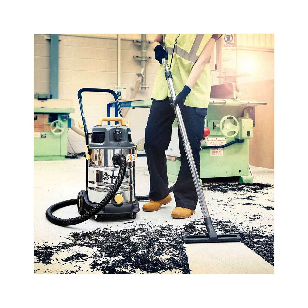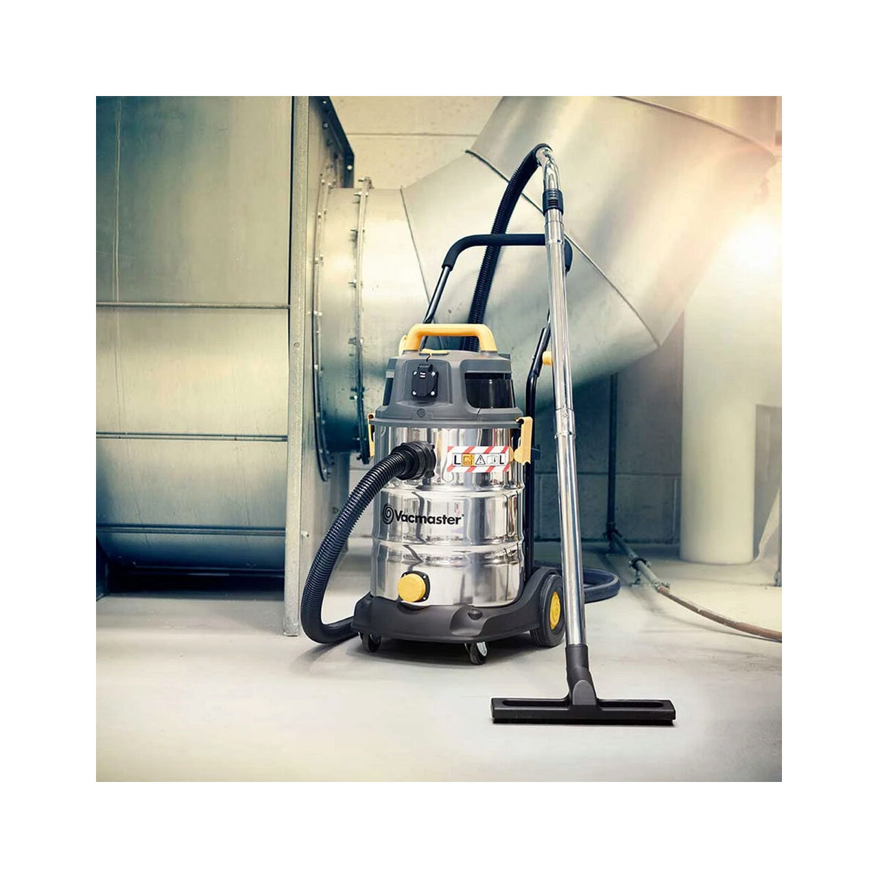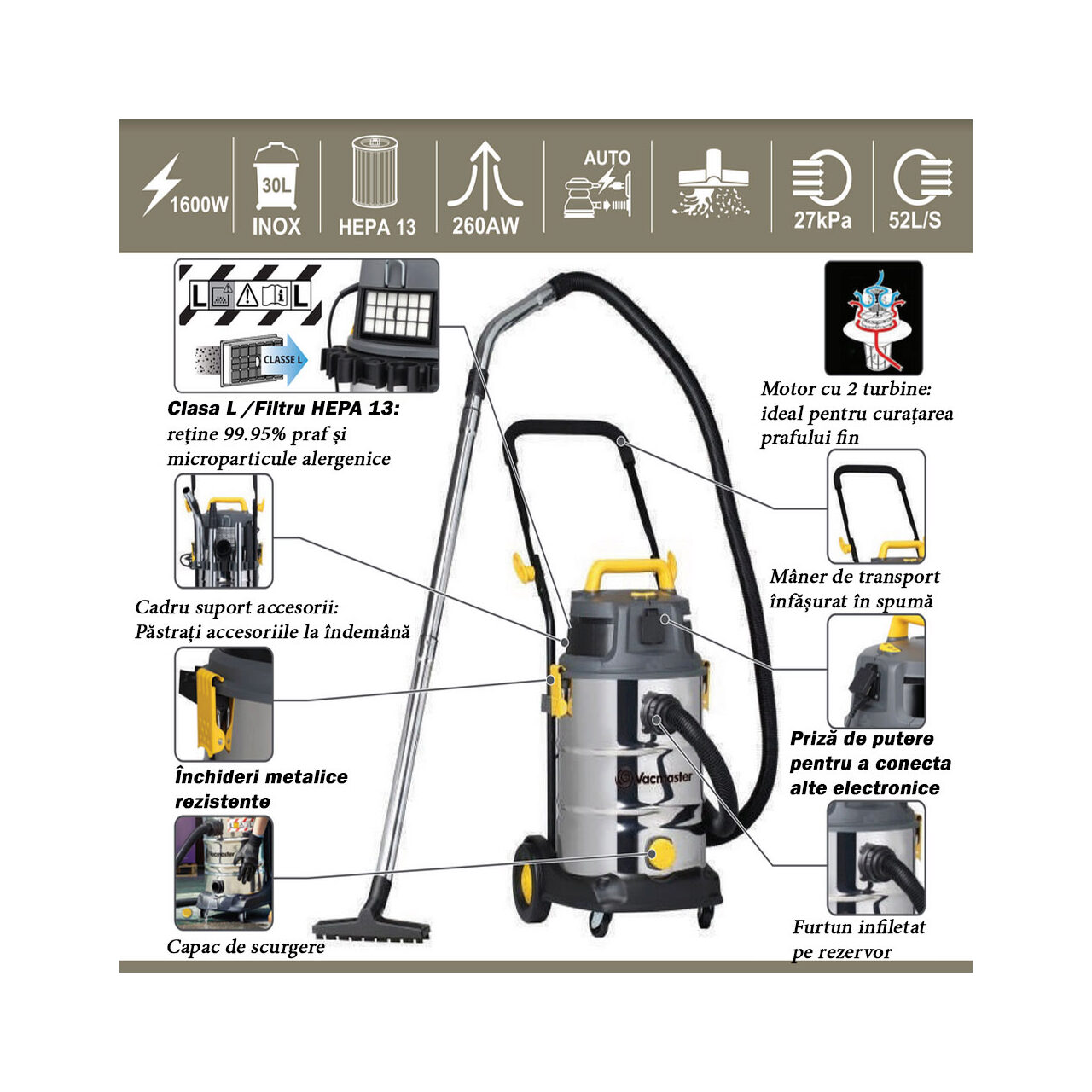 Special conceput pentru uz industial, ASPIRATOR VACMASTER vine echipat cu o cuva de 30L de INOX pentru colectia mizeriei, extensii de inox, control al aerului, lungimea furtunului este de 3.5M si cablu de alimentare de 5M ce iti ofera 9.5M pentru a ajunge in cele mai indepartate locuri.