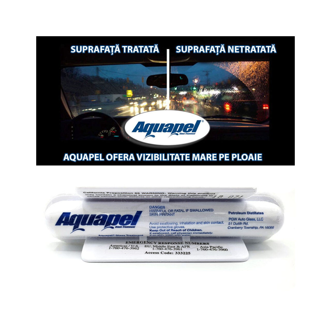 Aquapel Tratament Hidrofob pentru sticla sticla este dezvoltat de PPG Industries USA. Folosind tehnologie dezvoltata pentru industria aviatica, Aquapel Tratament Hidrofob Geamuri formeaza o legatura chimica cu geamul ceea ce creste capacitatea de respingere a apei, drept urmare apa curge foarte usor de pe geamuri. Aquapel Tratament Hidrofob Geamuri se aplica in doar cateva minute pe parbrizul curatat si uscat sau pe orice fel de suprafata exterioara din sticla, dureaza de pana la 6 ori mai mult decat tratamentele conventionale. Mai mult, Aquapel Tratament Hidrofob Geamuri ramane la fel de eficient dupa multe luni de la aplicare, in conditii normale de folosinta, incluzand ploaie torentiala sau zapada, spalari regulate, curatarea geamurilor si sarea de pe drumuri.