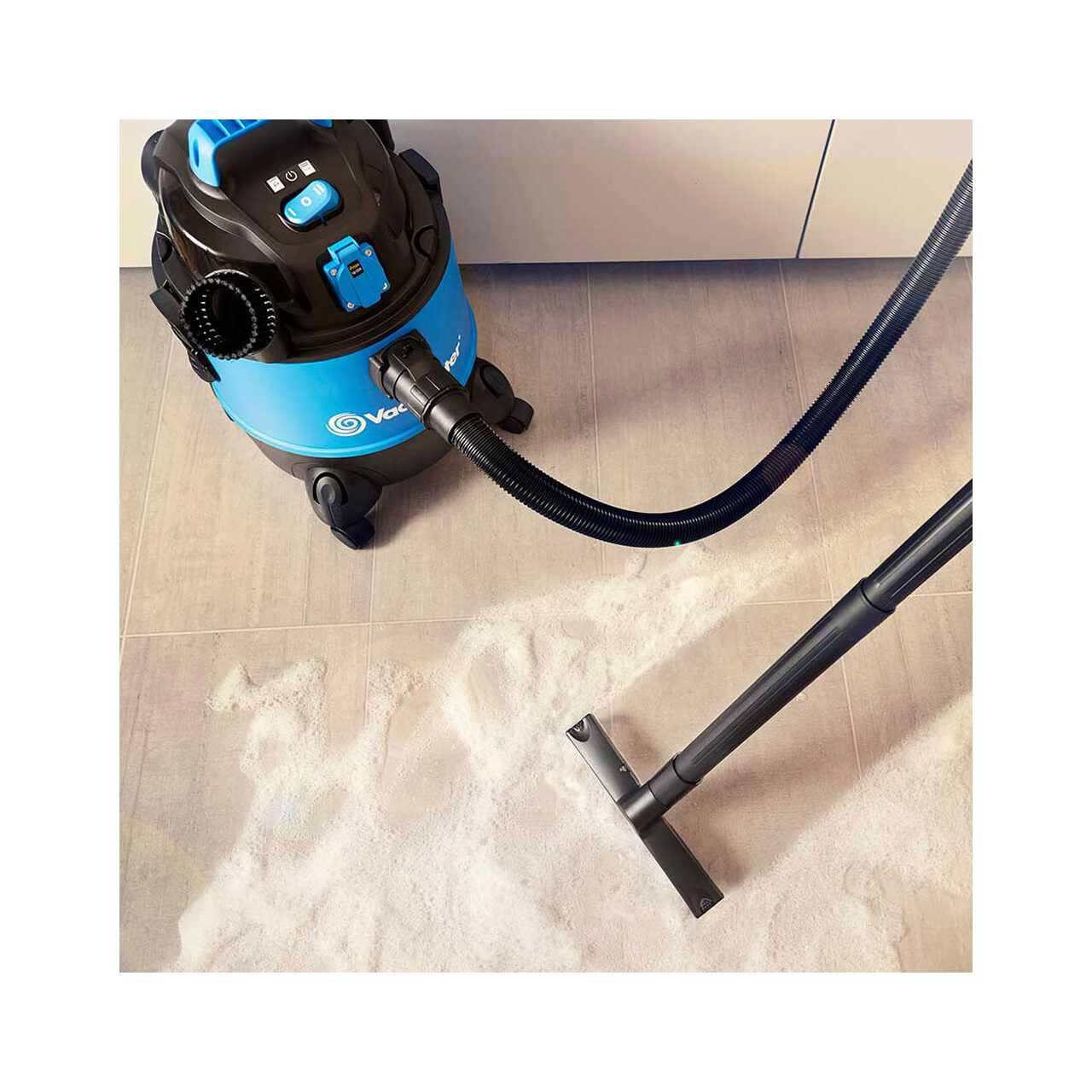8.Furtunul de aspirație flexibil de 2,5 m, extensie de plastic, 3x prelungitoare plastic și un cablu de alimentare de 4 m permit Vacmaster Multi 20 PTO să aibă distanta de lucru de aprox. 7,5 m.